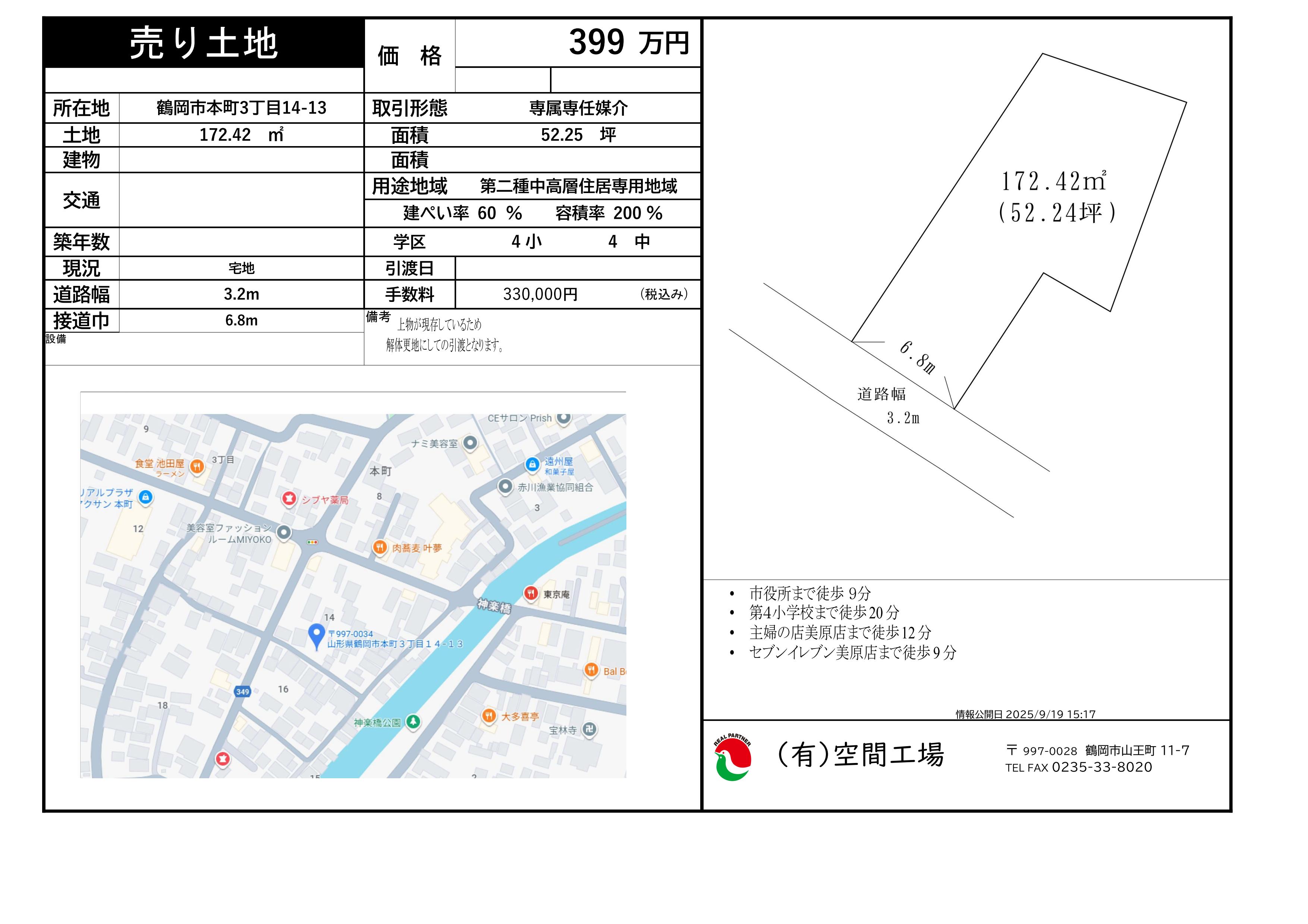 52.25坪 坪単価7.6万円 市役所まで徒歩9分 既存建物は、売主様にて解体更地にして引き渡し
